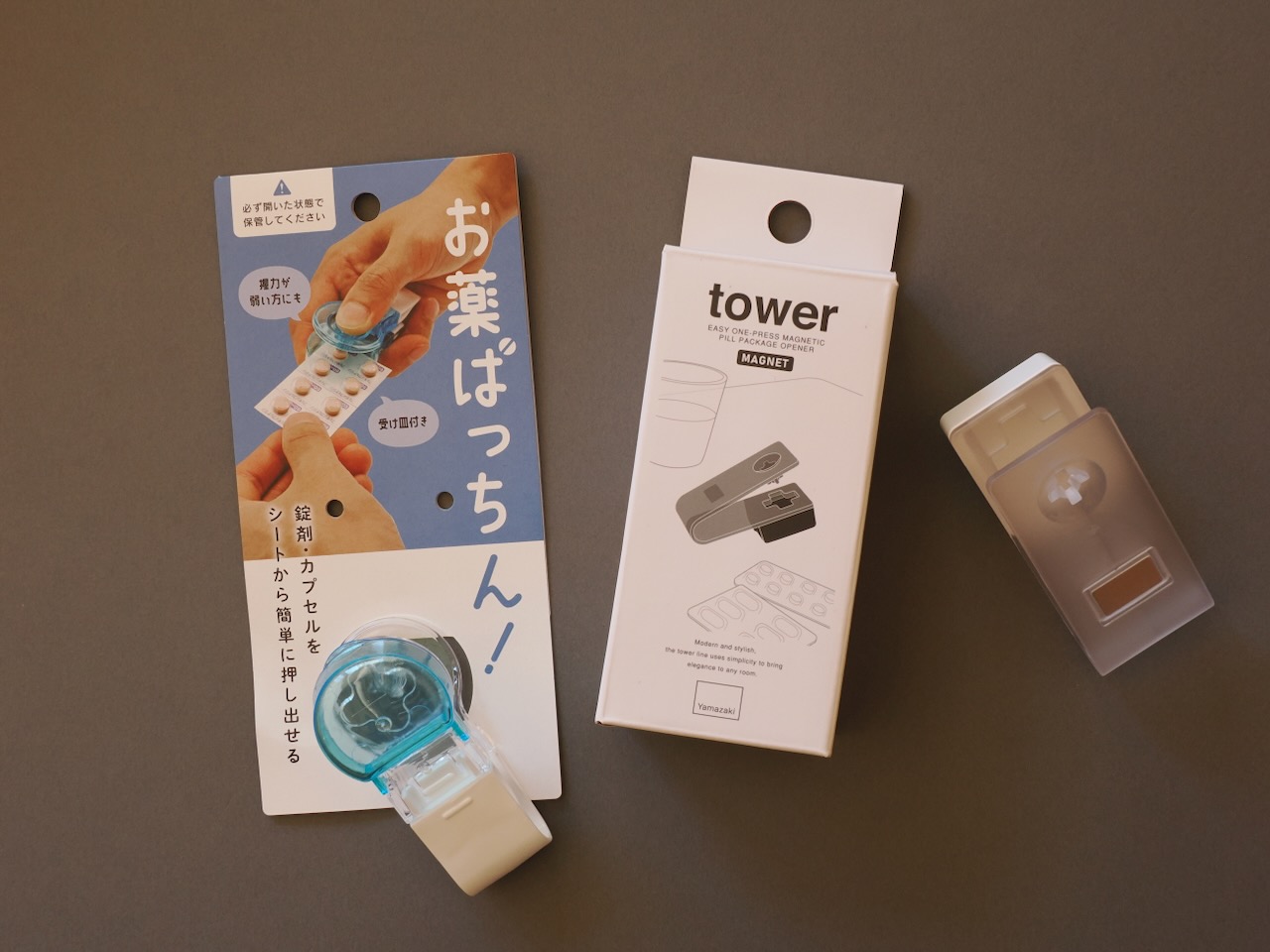 ・手で押し出すと破片を飲む事故があるのですが、これなら安全性が高い。家庭雑貨を次から次へと繰り出している山崎実業の「TOWER 押すだけ簡単マグネット錠剤オープナー」990円を手に入れたのですが、8mm×4mmの小さな細長い錠剤でも押し出すことができました。