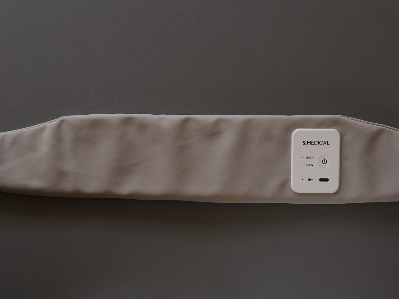 ・サイズは58cm×8.5cm×1cm、118g。Cタイプで充電のワイアレスで、2.5時間充電で約50分使用可。19800円。このネック用の他、腹部やお尻、太もも、ふくらはぎなどに使用する大きいタイプもあります。