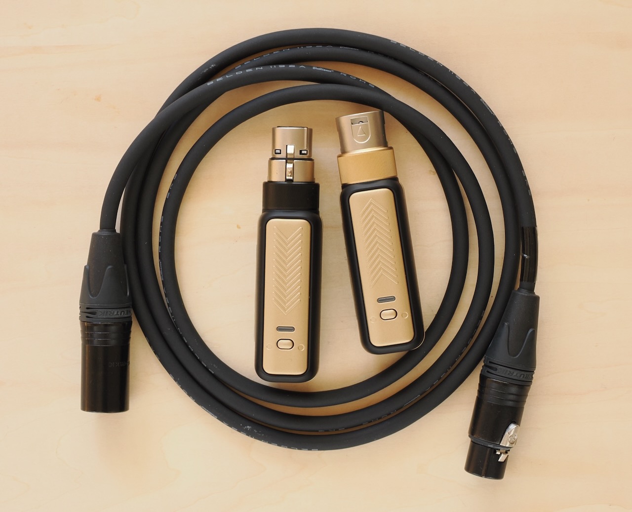 ・似たようなものは何社からも出ているのですが、これは超シンプル。2本並べてスイッチを入れると自動でペアリング(接続)するので、あとは差し込むだけ。使ってみたところ、音の遅延はほぼゼロ、音質もコード使用時と変わりません。何よりいいのは、コードが206gに対して106gで100gも軽く、スペパにも優れます。マイク持参派にはありがたい。