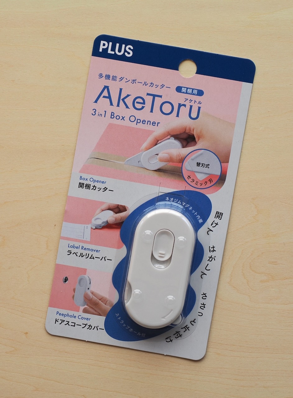 ・そんな通販ショッピングがストレスになるほど増えているのは確か。そのため通販荷物に使う道具が増えています。文具会社は、文具市場が飽和状態のせいか、文具以外の商品開発が目につきます。PLUSは多機能ダンボールカッター「アケトル」なるダンボール荷物開梱用の道具を新発売。